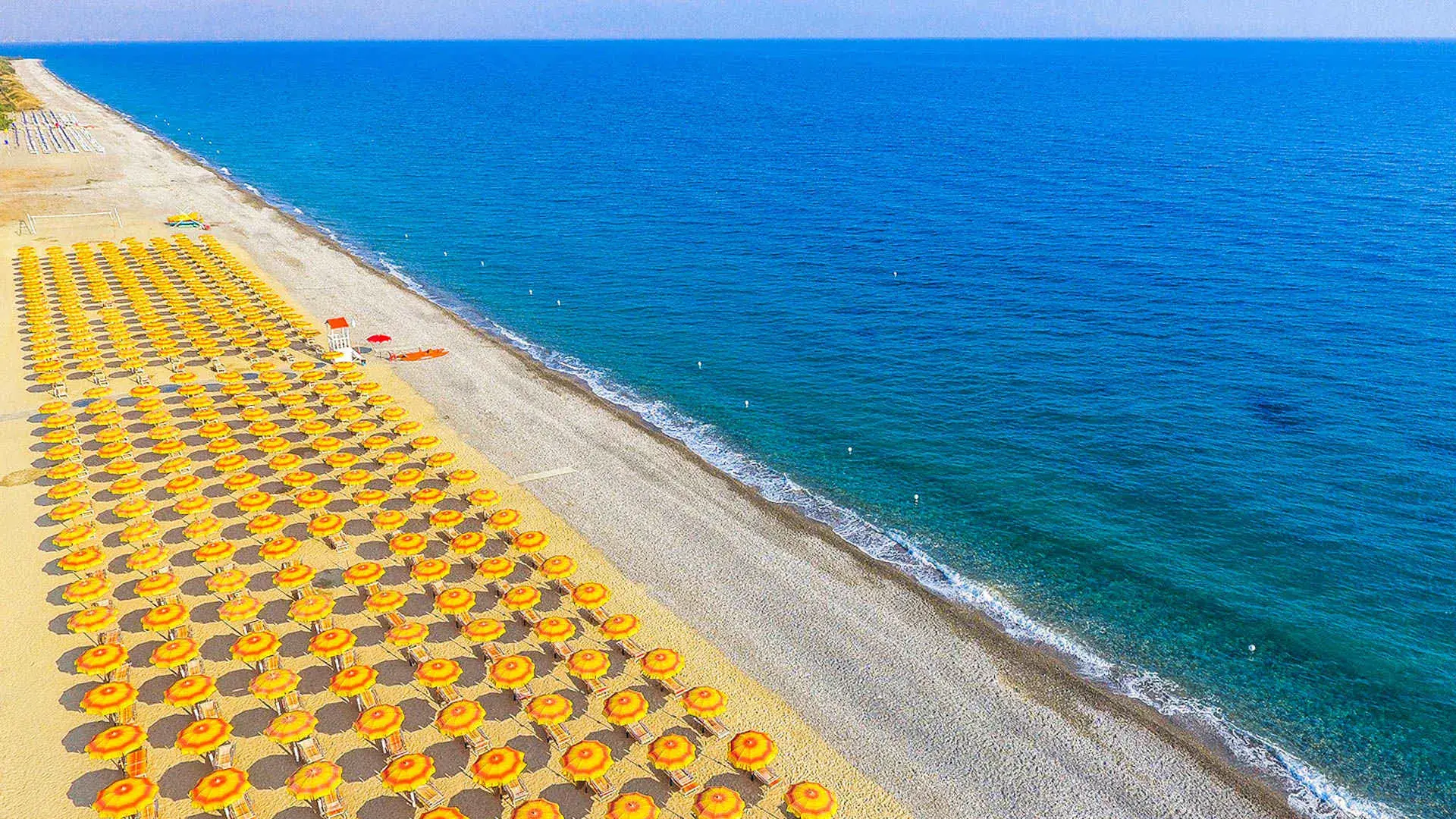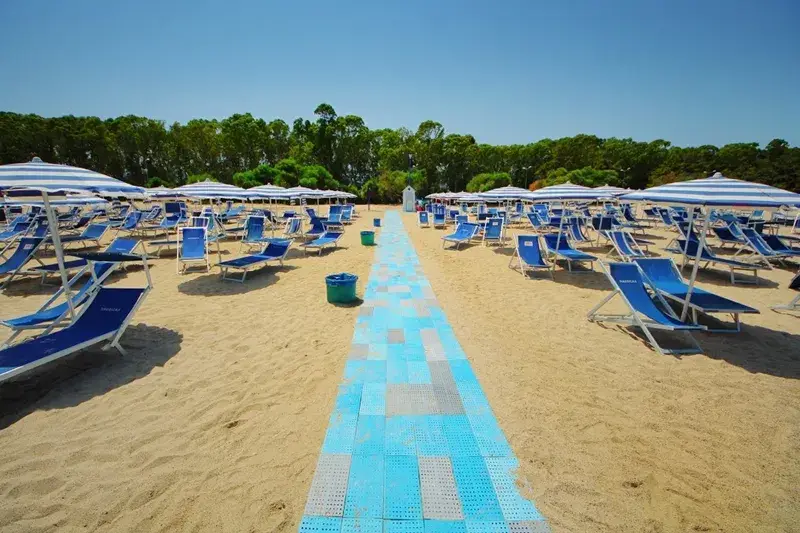 Con accesso diretto, di sabbia e ghiaia, riservata e attrezzata. Servizio spiaggia incluso nella Club Card a partire dalla 3° fila (1 ombrellone + 2 lettini o sdraio ad unità abitativa).