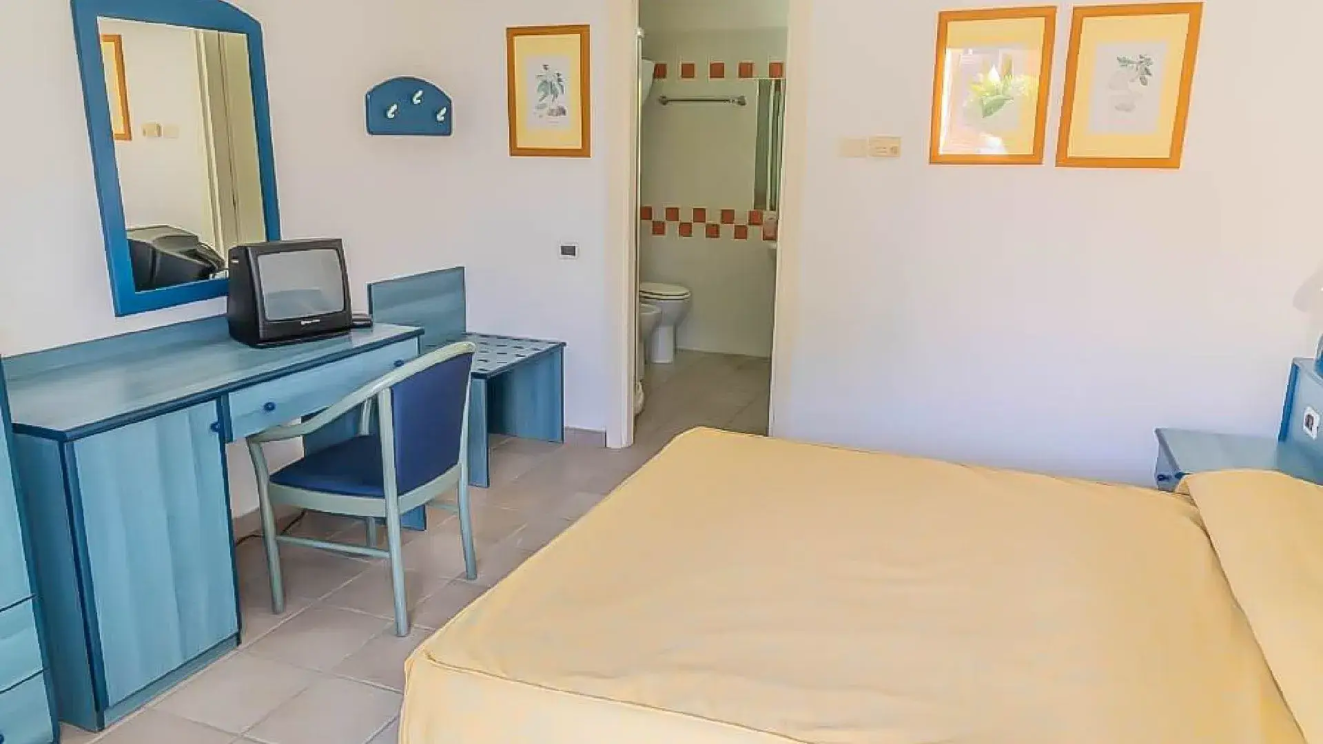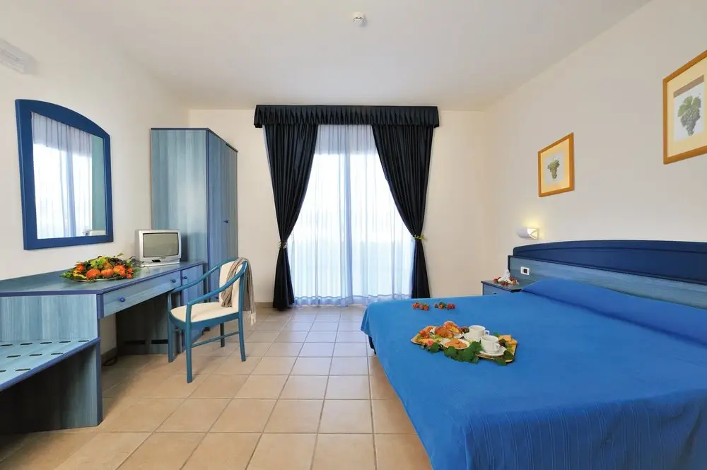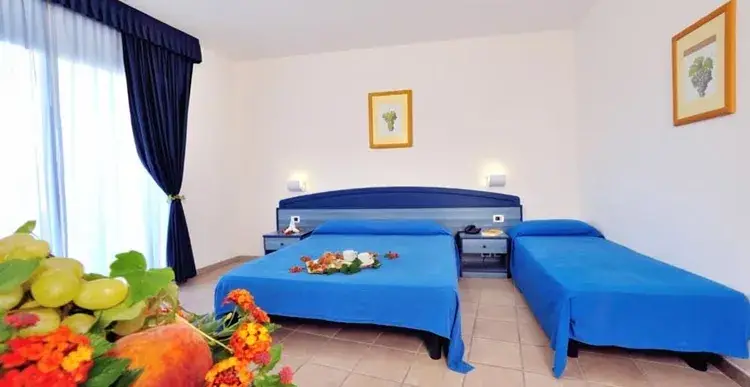 Camere in stile mediterraneo: singole, doppie, triple, triple plus e suite 4/5 posti (2 ambienti e 1 bagno). Dotazioni: servizi con doccia, aria condizionata, TV satellitare, phon, cassaforte, telefono, frigobar, patio o balcone. Triple: matrimoniale + letto aggiunto. Triple plus: possibile 4° letto. Suite: camera matrimoniale + soggiorno con divani letto + eventuale 5° letto. Disponibili camere per ospiti disabili.