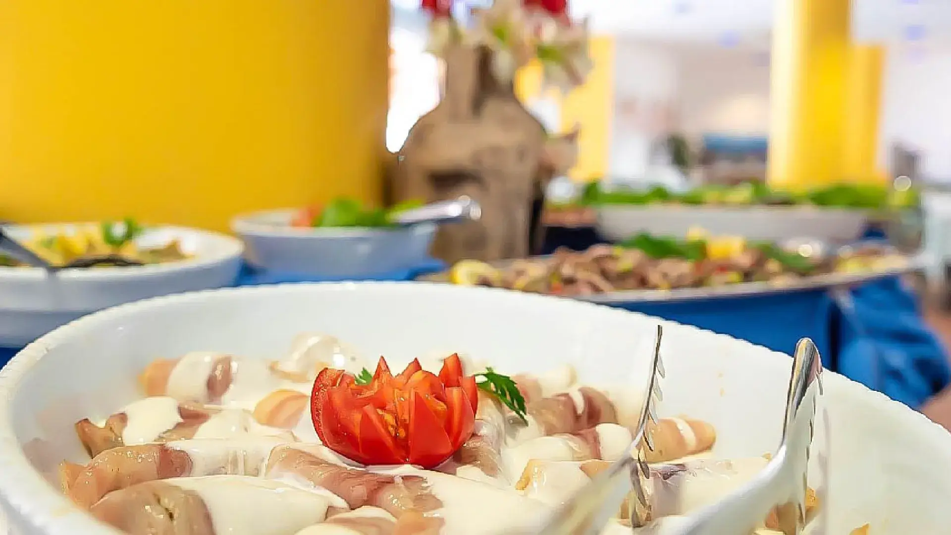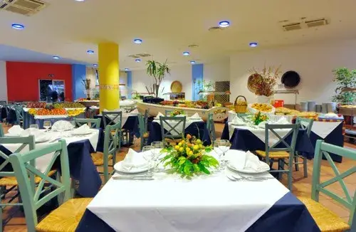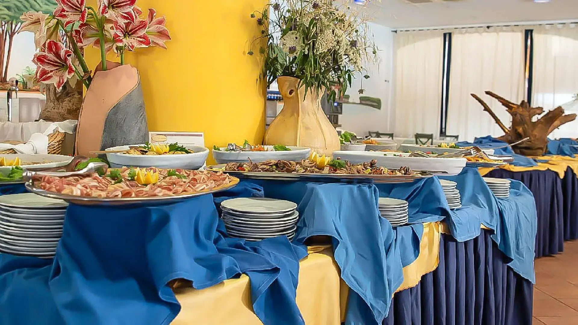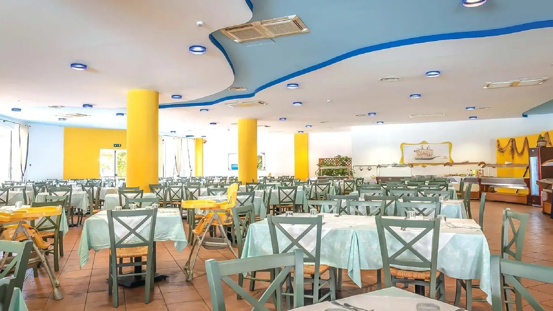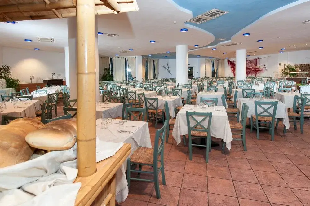 Due ristoranti: “CLUB” (centrale, climatizzato) aperto per colazione, pranzo e cena a buffet con cucina regionale/nazionale/internazionale, accessibile anche per ospiti con disabilità. “Al Terrazzo” (Pizzeria/Grill) aperto la sera nel periodo 26/06–11/09, su prenotazione, con angolo show cooking. Biberoneria (0–2 anni) con prodotti specifici e assistenza.