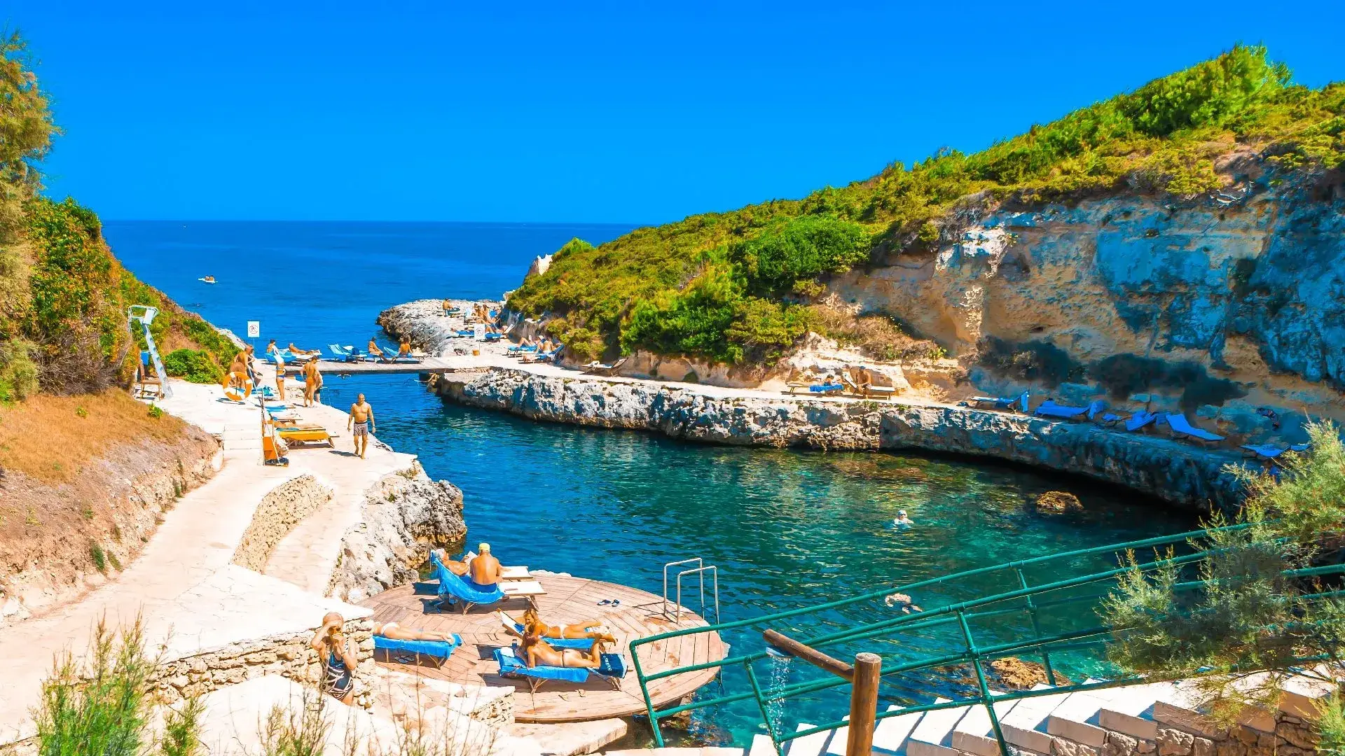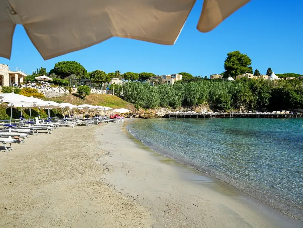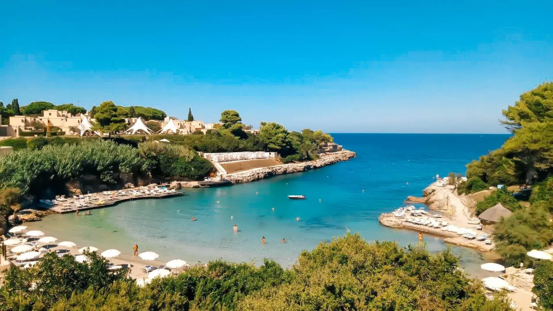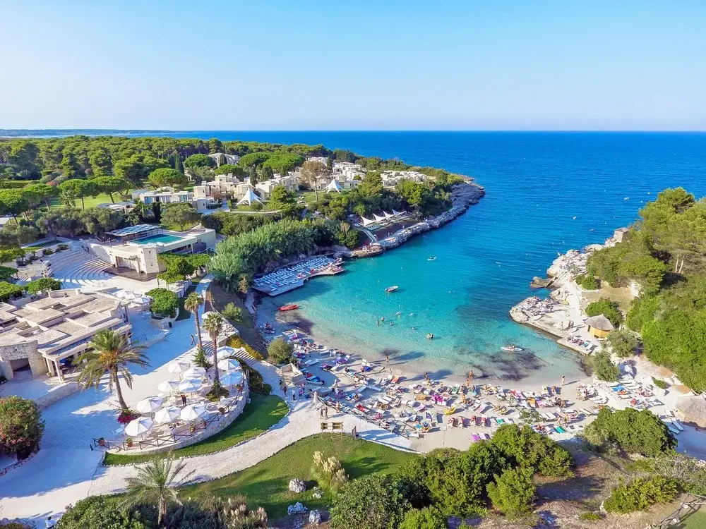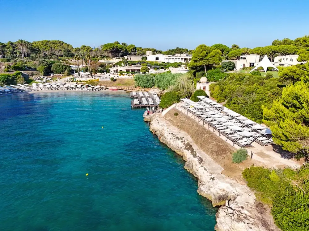 È affacciato su una splendida Baia tra acque cristalline, palme e cipressi che toccano il cielo, in una terra ricca di storia e cultura. Una seconda caletta denominata Rada della Caréula, riservata, quasi intima, formata da piccole insenature e da una grotta (Grotta delle Pupe) è una piscina naturale dove la bellezza di questo angolo di Puglia raggiunge la sua apoteosi.